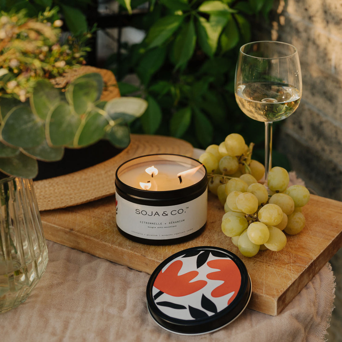 On aime aussi beaucoup la bougie d'extérieur Citronnelle + Géranium de SOJA&CO. avec ses arômes de fruits, d’aneth, d’agrumes, de géranium et de rose. En plus, grâce à son pot en acier et son couvercle facilement refermable, on peut la trimballer avec nous lors de nos vacances d'été au chalet ou même en camping!