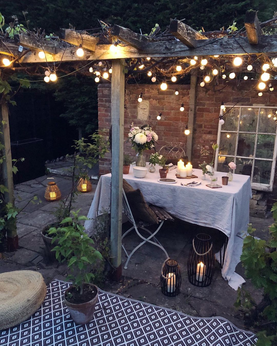Utilisez différentes sources lumineuses et mélangez-les; lanternes, guirlandes électriques, bougies, éclairage solaire, etc. Une fois la nuit tombée, ce décor scintillera de mille feux.