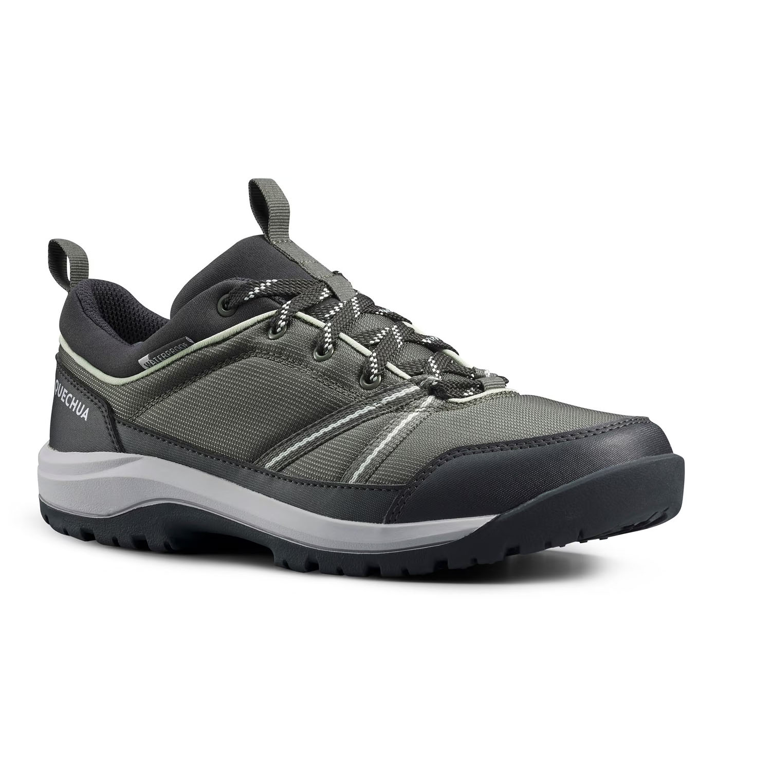 Ces chaussures imperméables résistent à deux heures de randonnée sous une pluie fine. Grâce aux crampons de 4 mm, leur semelle en caoutchouc assure une bonne adhérence et favorise l’évacuation de la boue. Elles sont conçues pour les sentiers naturels. Évitez donc de les porter sur l’asphalte, au risque de voir la semelle s’user prématurément.