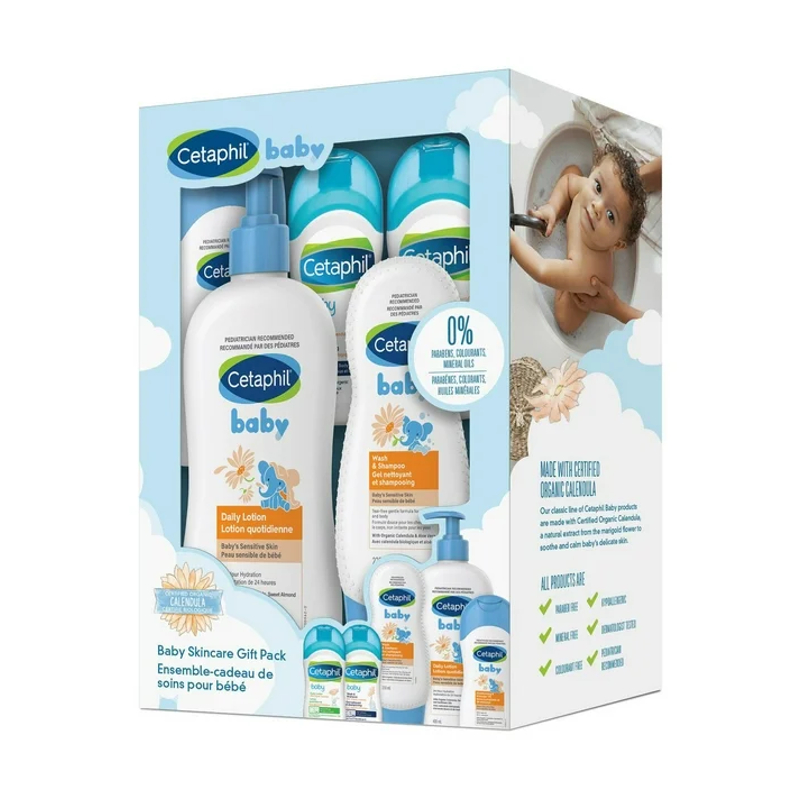 Ce cadeau est idéal pour les futures mamans. Un ensemble complet de soin pour la peau qui comprend : un gel nettoyant et shampooing de 230 ml, une lotion quotidienne de 400 ml, une huile hydratante de 200 ml ainsi que des échantillons de gel nettoyant et shampooing et de lotion quotidienne en prime pour le sac à langer.