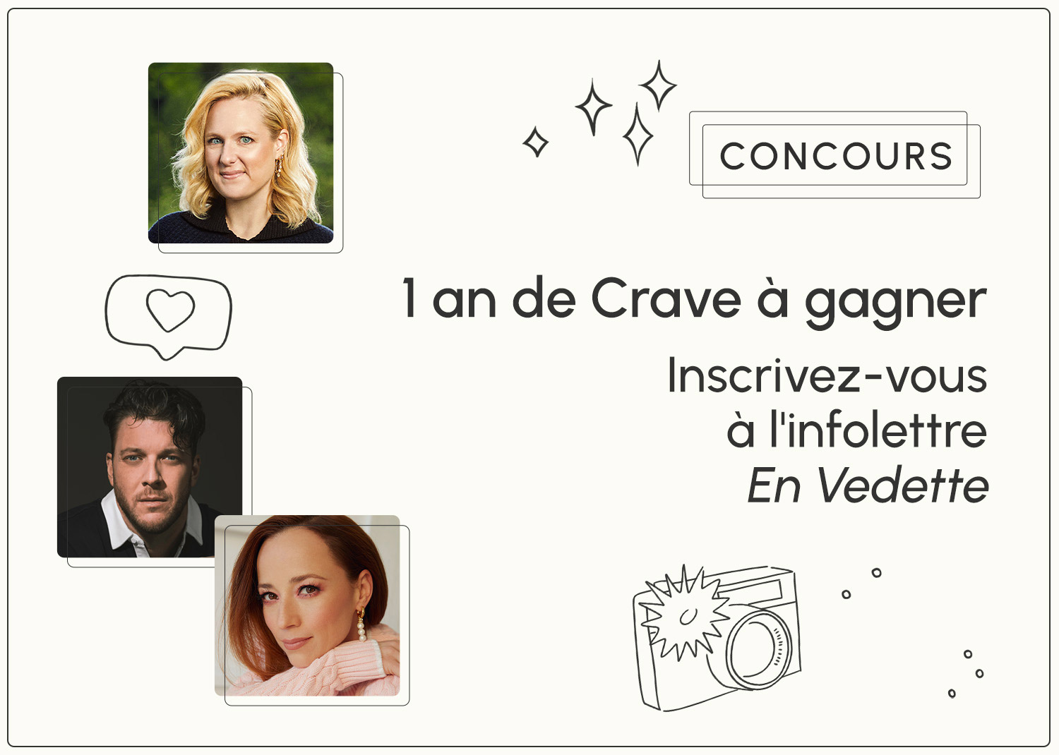 Ne manquez plus aucune nouvelle au sujet de vos célébrités préférées en vous inscrivant à notre infolettre En Vedette! En bonus, courez la chance de gagner un abonnement d'un an à Crave Premium.