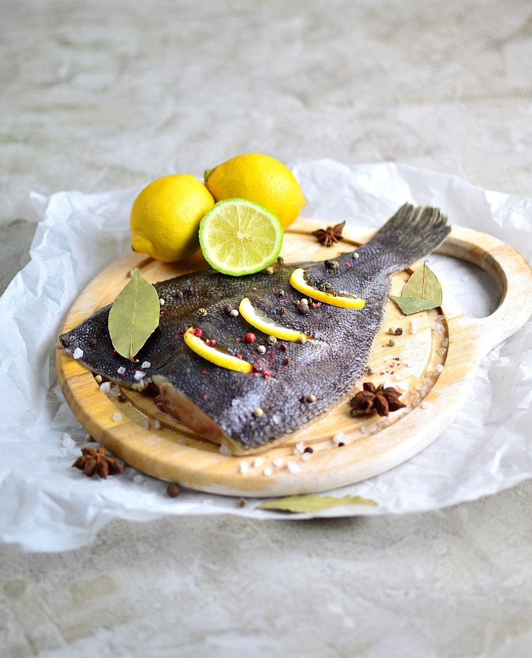 Le turbot, ou flétan du Groenland, est un cousin éloigné du flétan et son goût s'en rapproche un peu, même si sa texture est assez différente. C'est un poisson de mer plat, en forme de losange, qui a les deux yeux du même côté. Ses écailles ressemblent à de petites excroissances de cartilage disséminées un peu partout sur son corps.