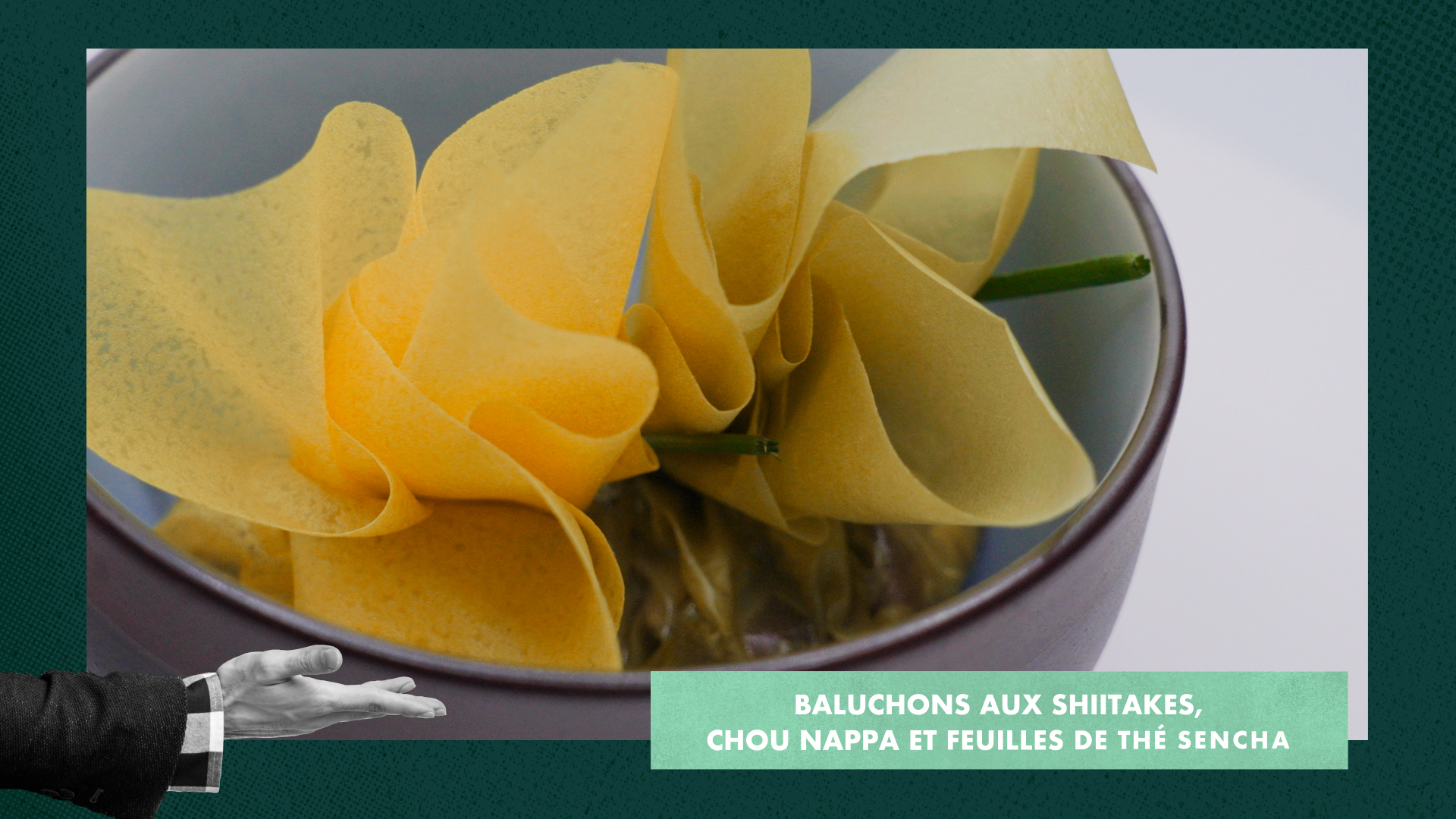 Baluchons aux champignons shiitakes et chou nappa avec feuilles de thé vert Sencha