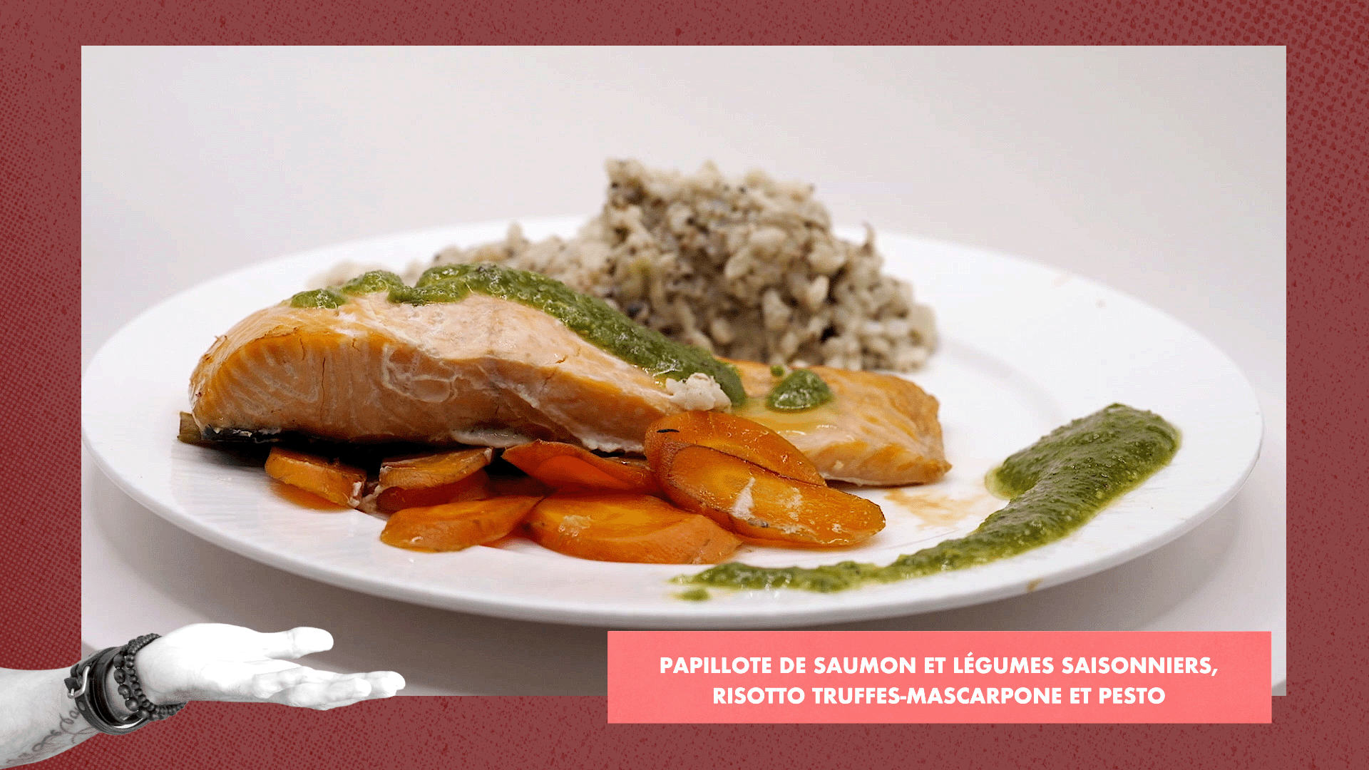 Papillote de saumon et légumes saisonniers, risotto truffes-mascarpone et pesto