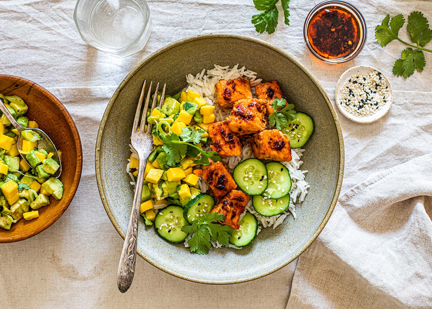 Un bol tout en fraîcheur! Le saumon au gingembre se marie merveilleusement bien avec la mangue et l'avocat!
