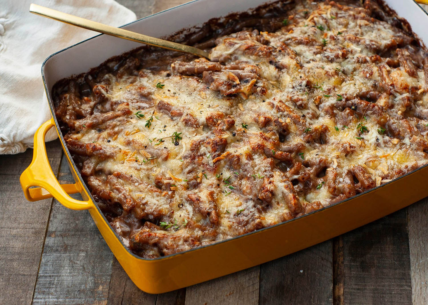 Tout le réconfort d'une soupe à l'oignon gratinée dans un plat de pâtes au four!