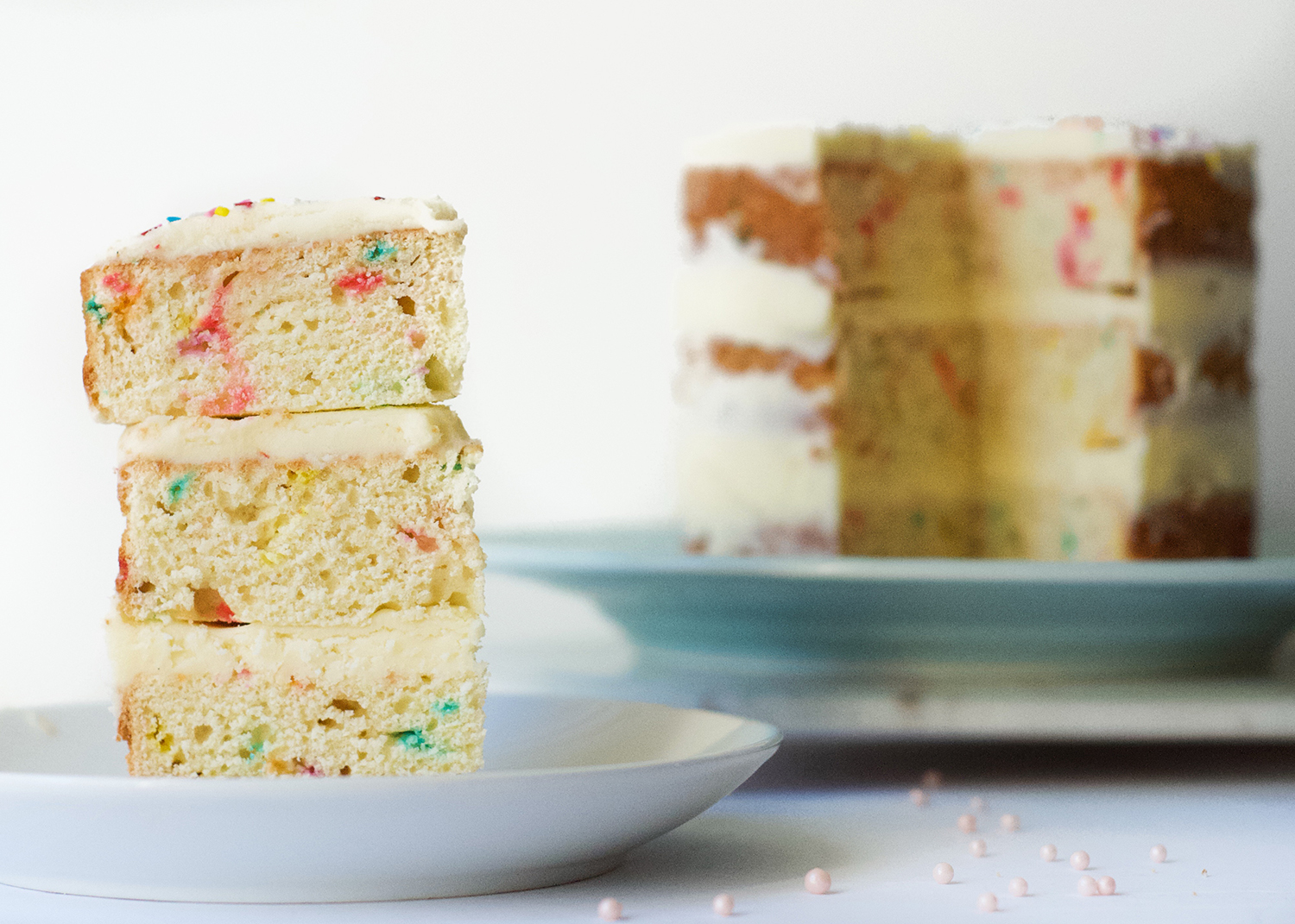 Il n'y a pas d'âge pour un magnifique gâteau de fête à la vanille et aux vermicelles de bonbons arc-en-ciel. C'est tellement festif!