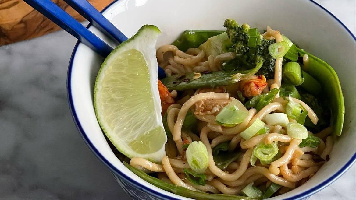 Incorporer les nouilles, les légumes et les fruits de mer à la sauce en mélangeant délicatement. Ajouter un peu d’eau, si nécessaire. Une fois la préparation bien mélangée, laisser cuire 1-2 minutes et retirer du feu.