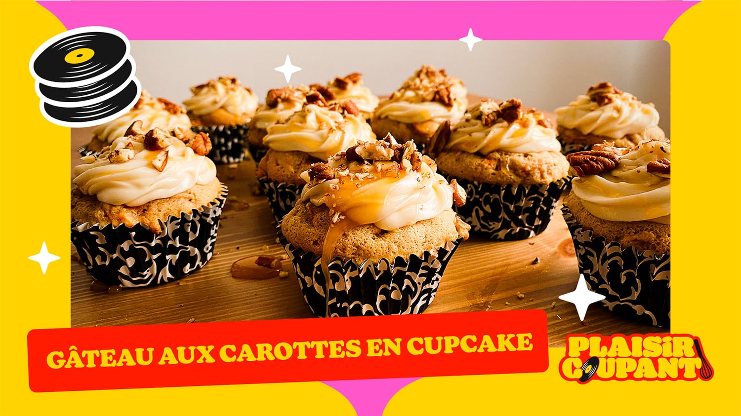 Laisser les cupcakes refroidir 10-15 minutes avant de les garnir de glaçage au fromage à la crème, de caramel et de pacanes.