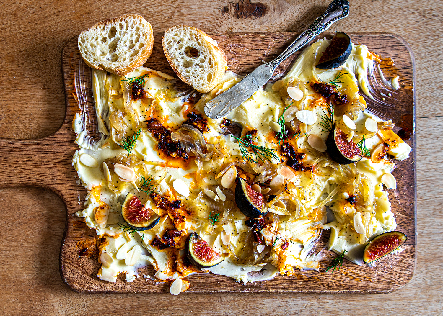 Un plateau de beurre (le fameux «Butter board» tendance de Tik Tok!) décadent à servir à vos invités à l'apéro, où chacun se régale d'une beurrée onctueuse et garnie de bonnes choses!