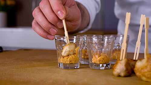 Saupoudrez les morceaux de poulet avec un peu de paprika fumé, piquez-les à l'aide de cure-dents et déposez-les tout simplement dans les shooters.