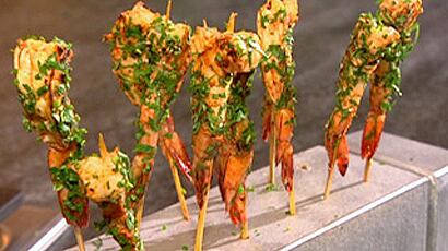 Déposez les brochettes sur une plaque de cuisson et faites cuire environ 2 minutes de chaque côté (même chose sous le grill).