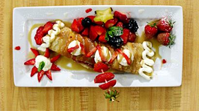 Napper une crêpe de fraises, rouler celle-ci et la déposer sur le caramel.