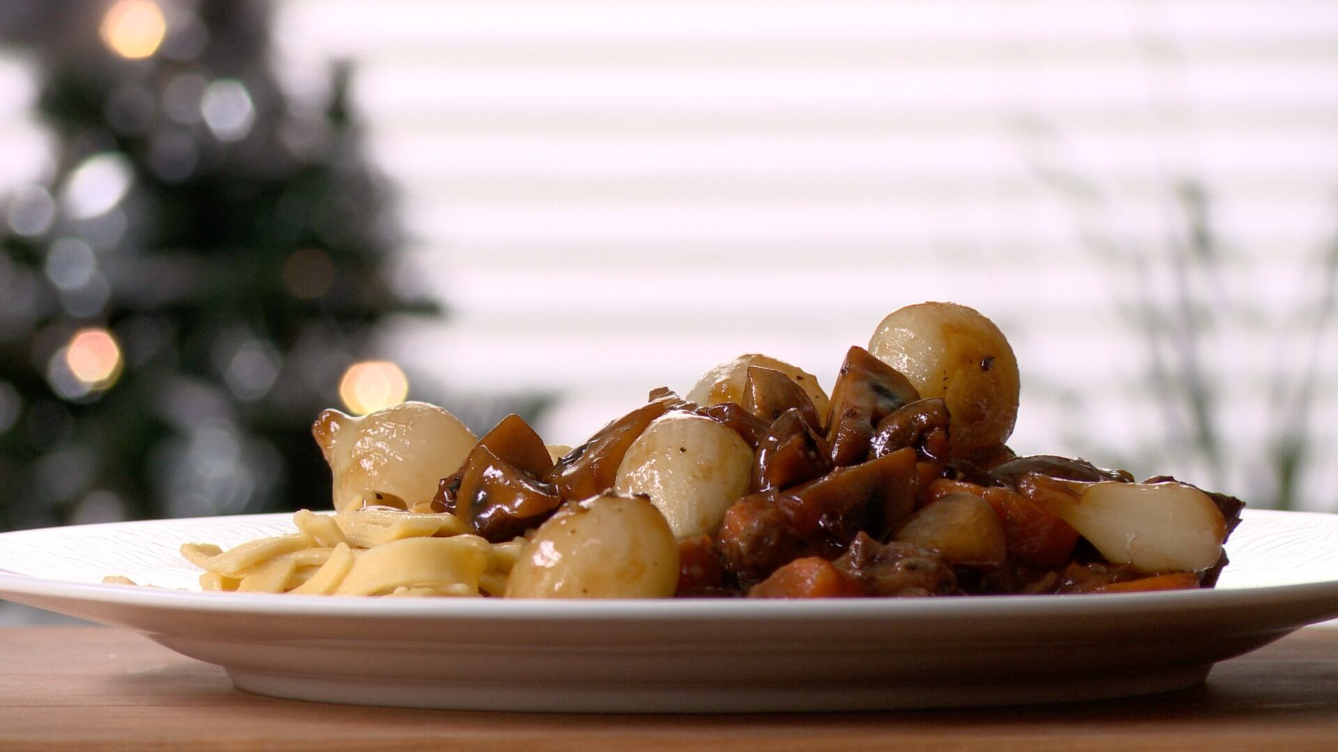 Servir la garniture sur chaque portion de bœuf bourguignon.