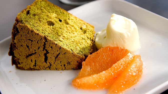 Servir le gâteau en tranches, garnies de crème fouettée, avec quelques suprêmes de pamplemousse.