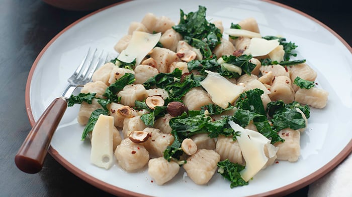 - Servir avec une sauce (marinara, bolognaise, crémeuse au fromage, pesto, etc.) ou encore différents accompagnements. Pour ma part, je trouve que les gnocchis sont à leur meilleur avec des ingrédients simples et savoureux! Ici : du kale revenu dans une poêle pendant 2 minutes avec de l'ail et de l'huile d'olive, des noisettes grillées, un filet d'huile de noisette, des flocons de piment fort et des copeaux de fromage fort.