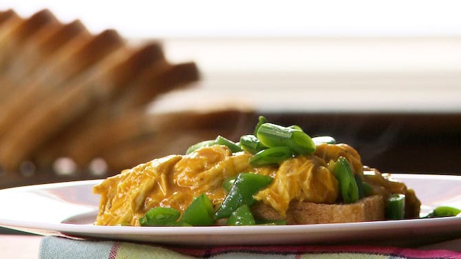 Servez une bonne louche de sauce au poulet sur une tranche de pain et accompagnez d'un peu de pois sucrés blanchis et coupés en dés.