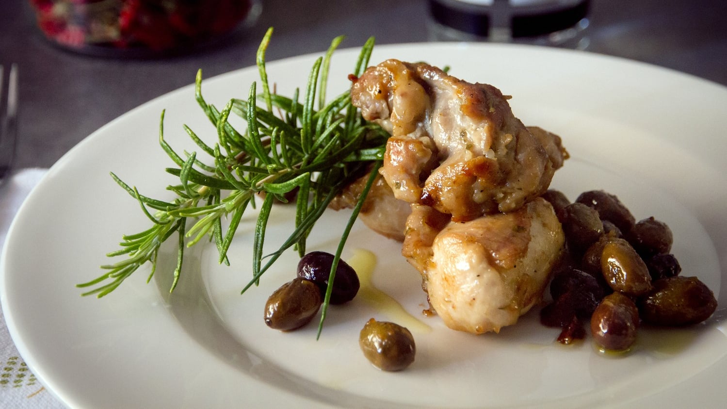 Déposer l’oignon, l’ail, le romarin et les olives dans un plat de cuisson allant au four.