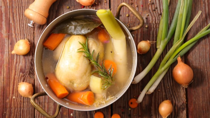 Dépecer le poulet en jetant les os et la peau. Conserver le poulet au frigo avec tous les légumes. Faire refroidir le bouillon dans un bol à part pour pouvoir le dégraisser.