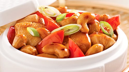 Ajouter le poulet, les noix de cajou et la sauce réservée. Poursuivre la cuisson de 2 à 3 minutes.