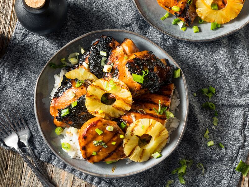 Dans un grand morceau de papier d’aluminium, placer les poitrines de poulet, l’oignon et la sauce barbecue. Placer deux tranches d’ananas sur chaque poitrine de poulet et refermer en papillote.