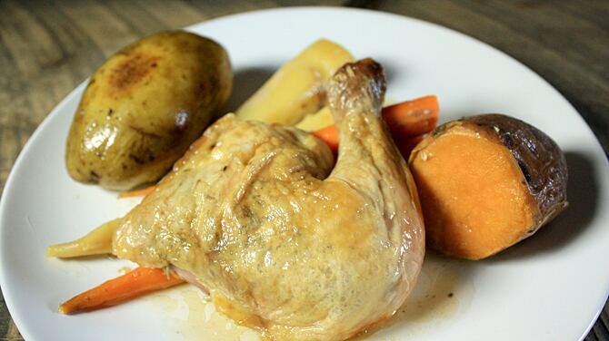 Répartir les patates douces et les pommes de terre de façon égale sur l'espace restant de la plaque et enfourner de 1 h 15 à 1 h 30, jusqu'à ce que les poulets soient cuits, en échangeant leurs positions à mi-cuisson.