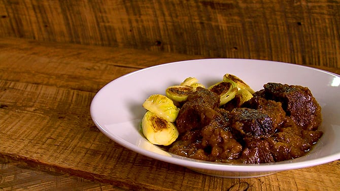 Remettre la viande dans la sauce. Rectifier l'assaisonnement et servir avec un légume vert au choix.