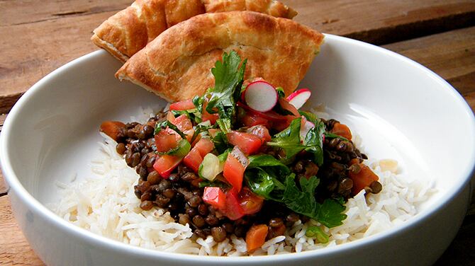 - Déposer le ragoût de lentilles sur le riz, servir avec la salade fraiche sur le dessus et le pain en accompagnement.