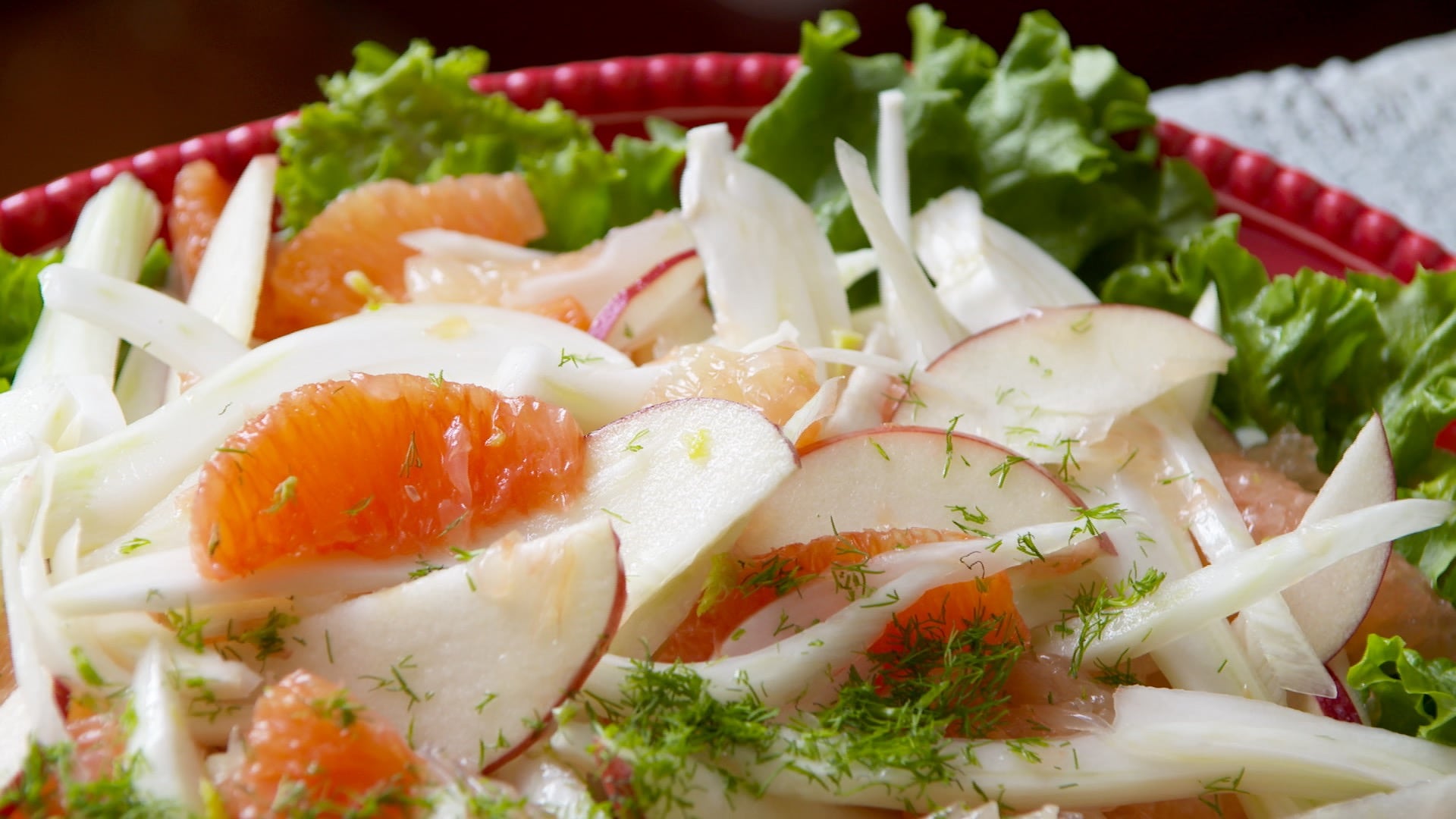 Dans un grand bol, mélanger les tranches de pommes, le fenouil et les suprêmes.