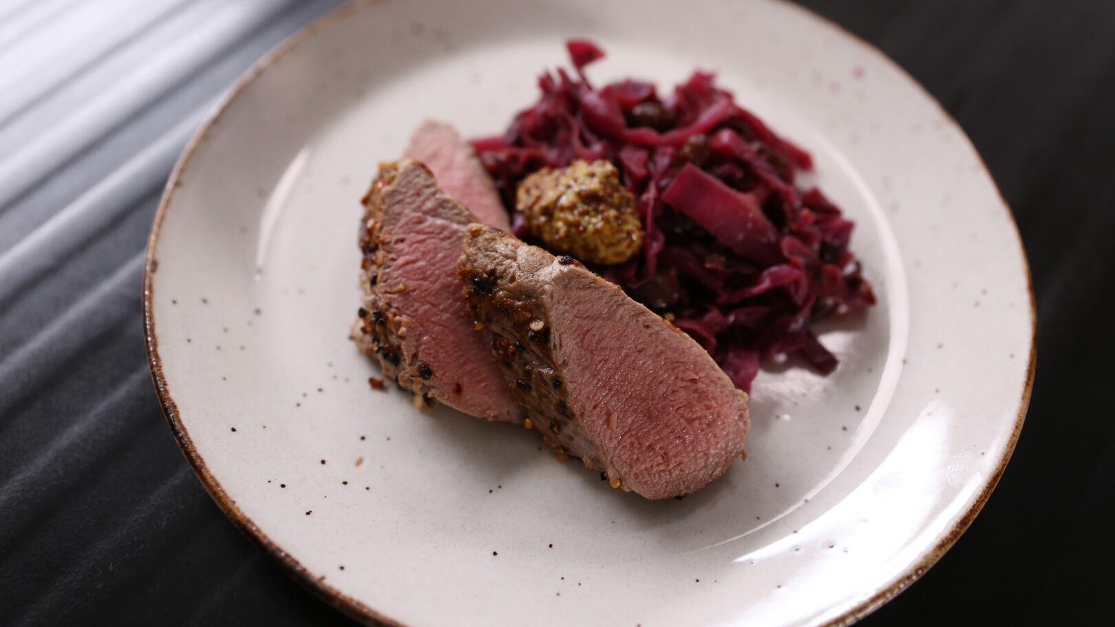 Couper des tranches de porc et les servir sur le chou, avec un peu de moutarde de Dijon ou à l’ancienne.