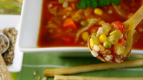 Ajouter le bouillon, le jus de tomate, la poudre de bouillon de poulet, les herbes salées, les graines d'aneth, le poivre et l'orge; amener à ébullition sur un feu modéré.