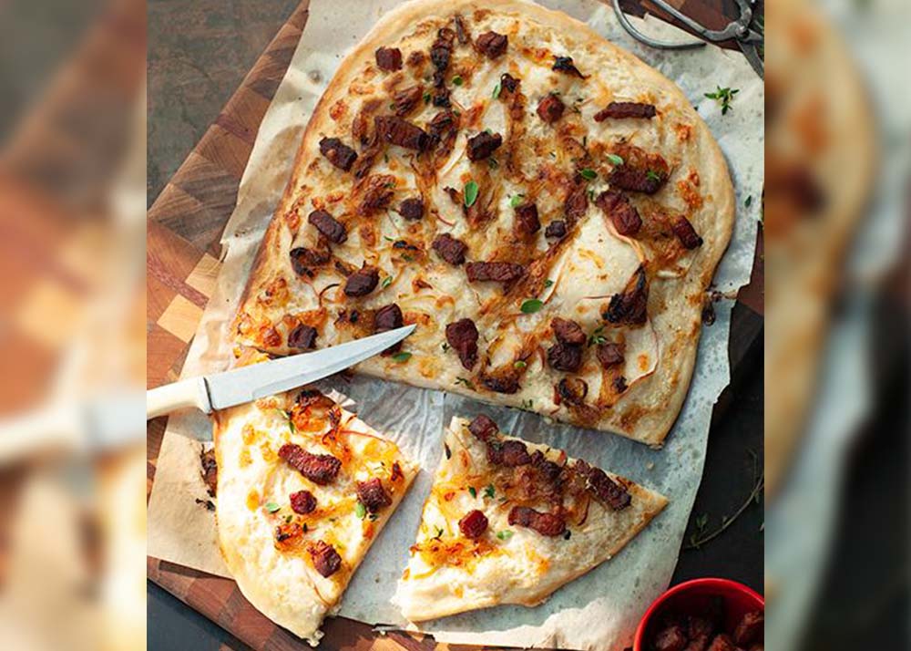Ce pain plat garni originaire de l'Alsace, aussi appelé « flammkueche » est tellement savoureux!