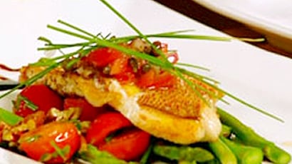 Déposer au centre de votre assiette un peu de salade d'asperges surmontée du filet de poisson.