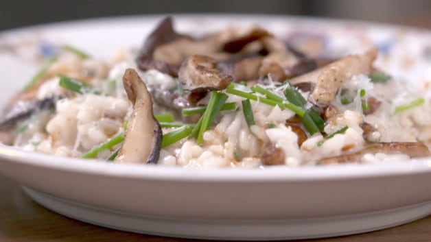 Garnir chaque portion de risotto avec le reste des shiitakes, de la ciboulette et 1 c. à soupe de jus de pomme réduit.