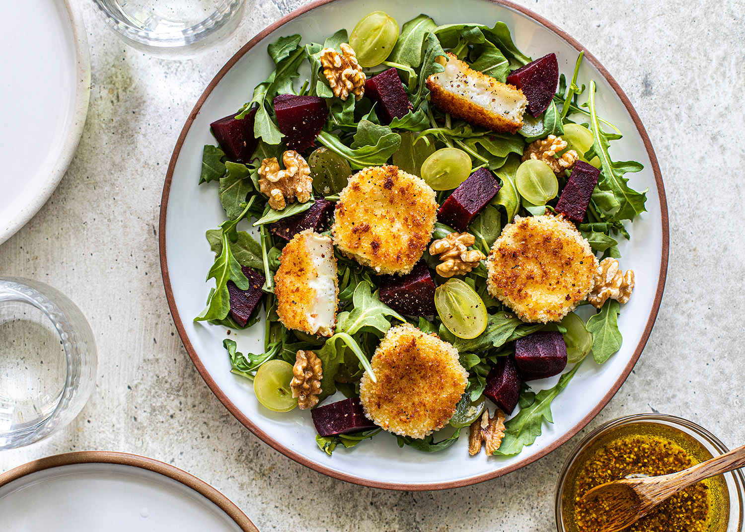 Quand le chèvre chaud rencontre le croustillant de la croquette et la fraîcheur des raisins, c'est le rêve! Mettez du bonheur dans votre assiette avec cette recette de salade surprenante.