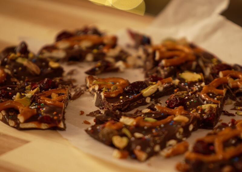 On verse du chocolat fondu sur une plaque avec des garnitures au choix, puis on envoie le tout au froid. Simple comme bonjour!