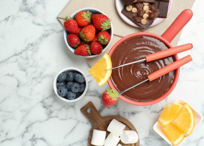 Cette onctueuse fondue au chocolat et au beurre d'arachides ne demande qu'à être pairée avec des framboises et des tranches de bananes...