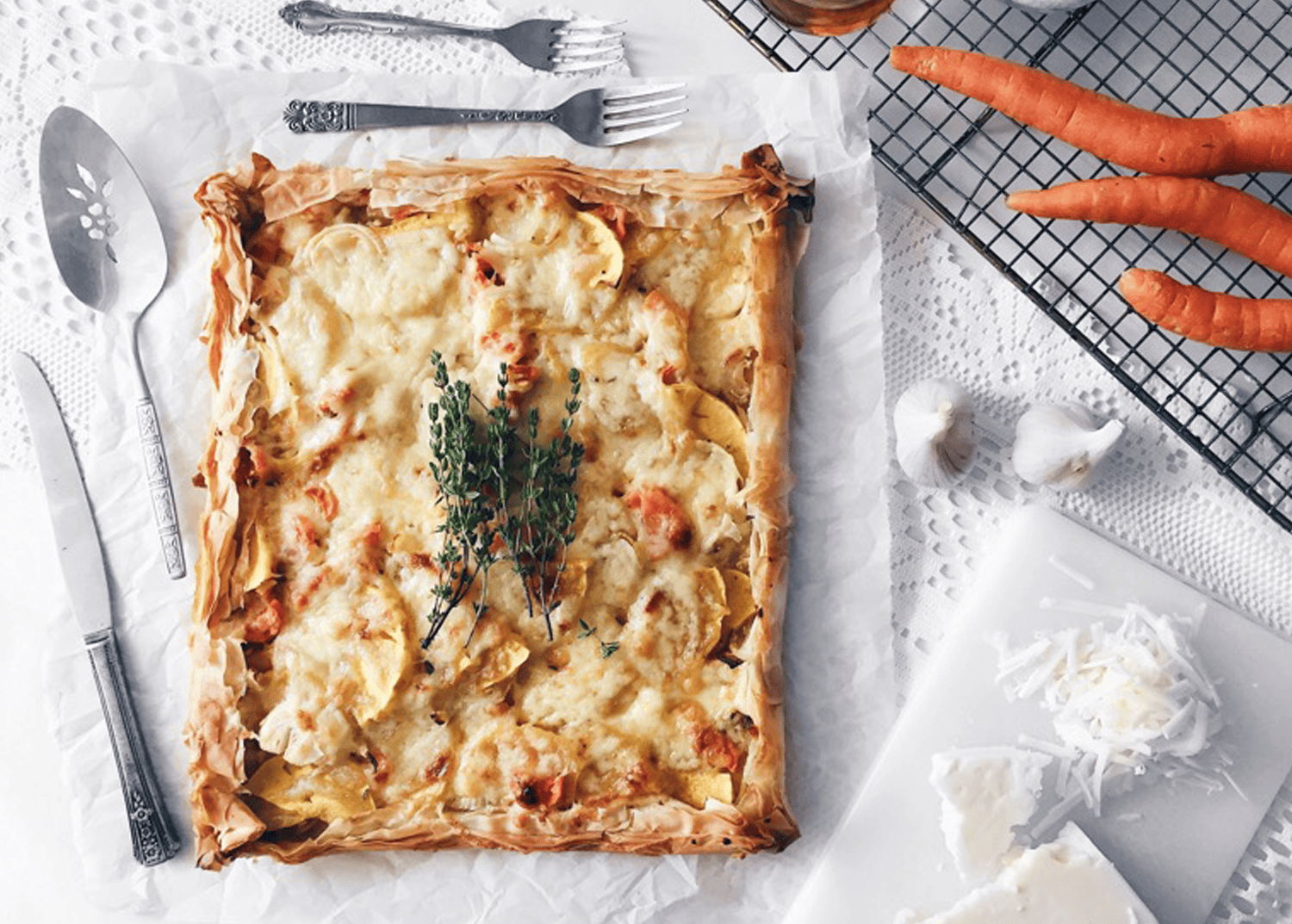 1. Tarte fine à la courge, carottes, fromage cheddar et thym