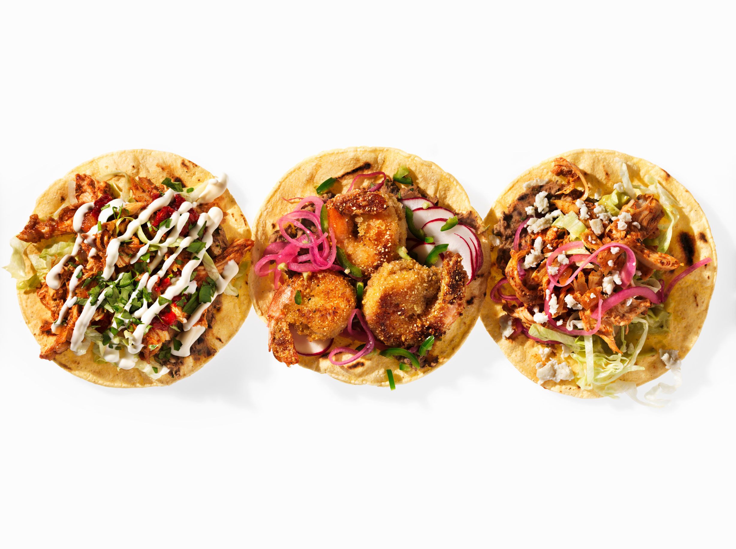 Un repas cette fois à saveur mexicaine: garnissez le pain préalablement chauffé au four pendant quelques minutes, de haricots frits, de laitue déchiquetée, d’oignon rouge émincé, de tomates en dés, de morceaux d’avocat, de crème sure, de jalapenos, de viande effilochée, de maïs en grain, de fromage râpé… Essayez aussi nos tostadas à l'avocat et thon, sans cuisson.