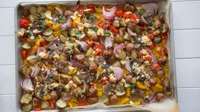 Assaisonné d'ail, citron, origan et fromage feta, on cuit le filet de porc sur une plaque avec des légumes tels que pommes de terre, poivrons et oignons. S'il y a des restes, ce sera excellent dans un pain pita avec une sauce au yogourt à l'ail. Consultez la recette complète ici.