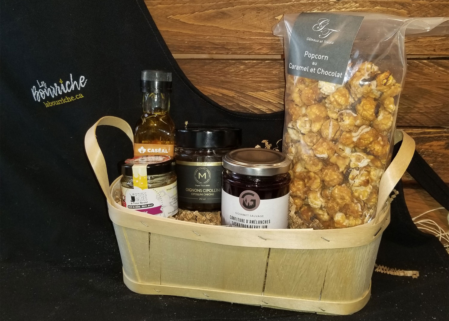 Pour l'épicurien qui aime les saveurs du terroir, voici un ensemble original qui comprend une vinaigrette érable et moutarde, un popcorn caramel et chocolat, de la confiture d'amélanches sauvages, des oignons cipollini marinés et de la gelée de bière. Des délices qui conviennent parfaitement aux végétariens!