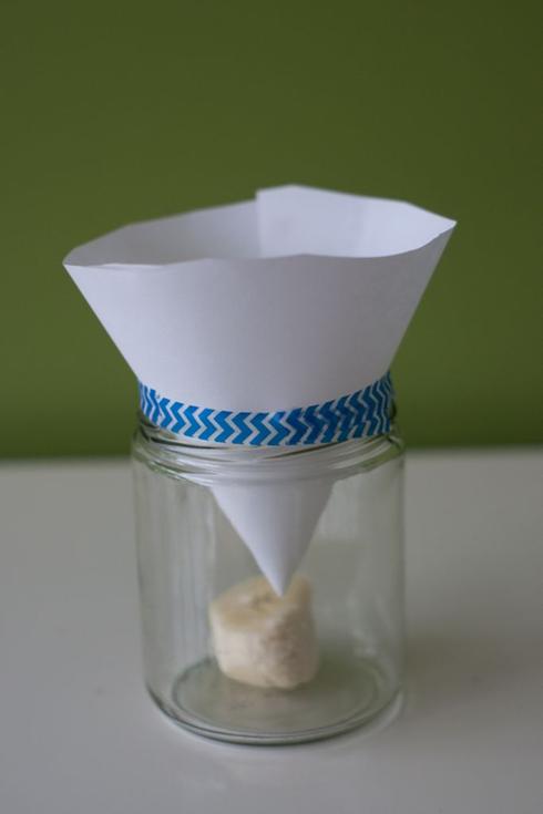 - Former un cornet/entonnoir avec la feuille de papier. Le trou au fond doit être minuscule: les mouches doivent pouvoir y entrer, mais pas en ressortir.