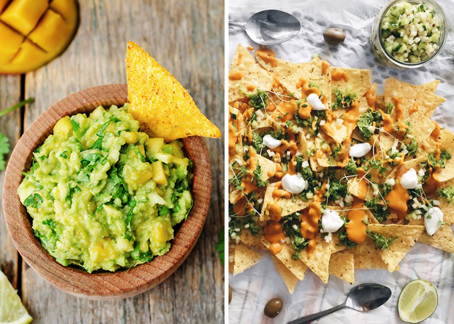 1. Nachos santé végétaliens à la salsa verde avec sa relish maison et sa sauce «fromagée»