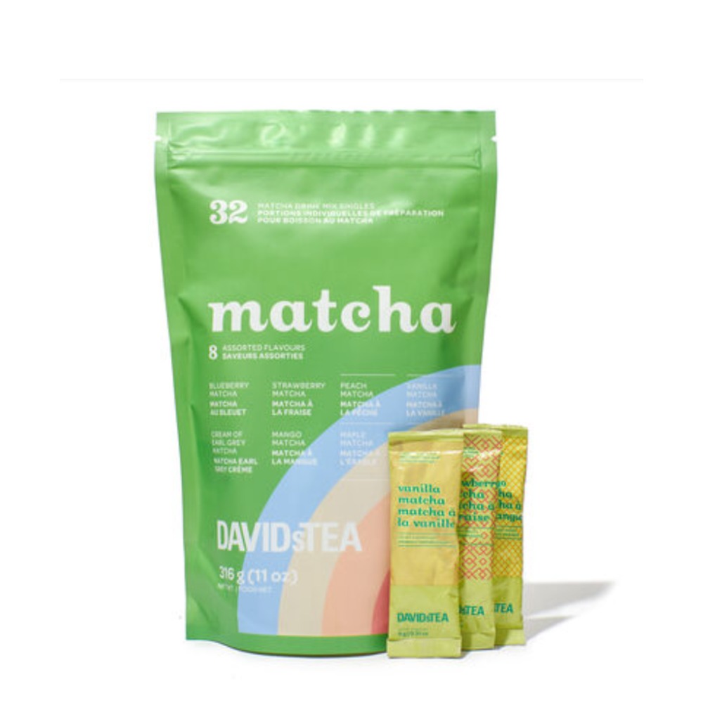Pas donné, le thé matcha! C'est donc le moment ou jamais de faire des provisions pour en boire tout l'hiver, puisqu'il est en solde chez Davids Tea pour le Vendredi fou. C cet ensemble de 32 portions individuelles est uUn format idéal pour goûter de nouvelles saveurs comme le Matcha Earl Grey crème, le Matcha chaï ou le Matcha à la mange.