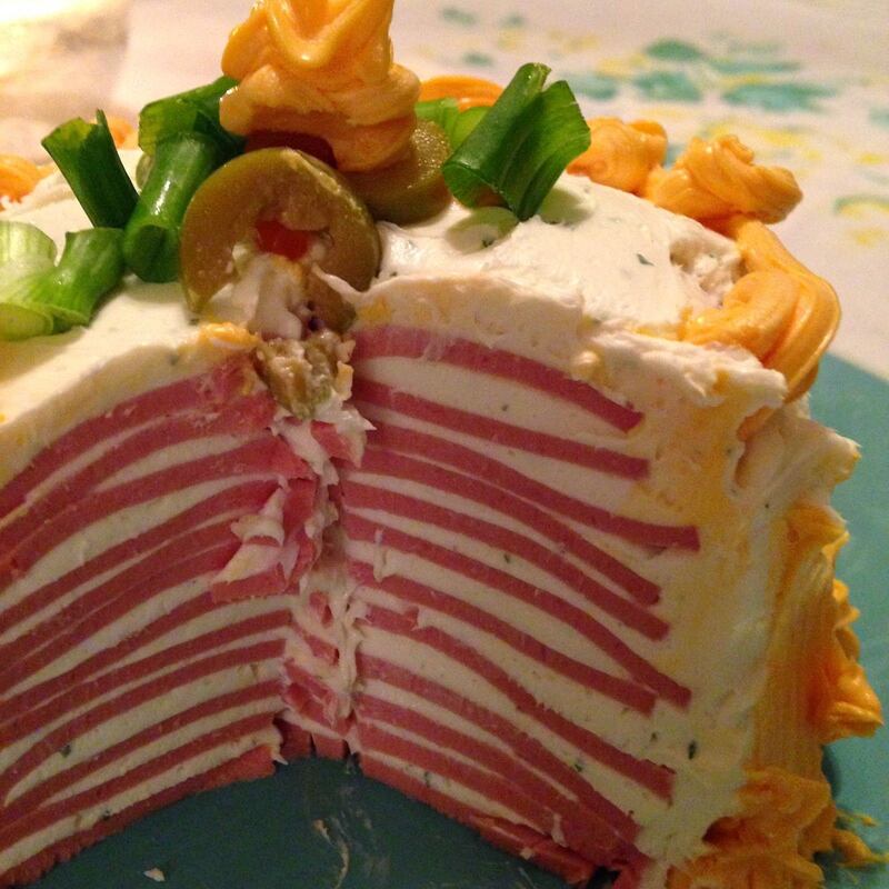 On retrouve plusieurs recettes avec du baloney, mais celle qui mérite la palme d'or reste certainement le gâteau au baloney.... un étagé de tranches de viandes froides avec du fromage à la crème. J'ai soudainement mal à l'estomac!