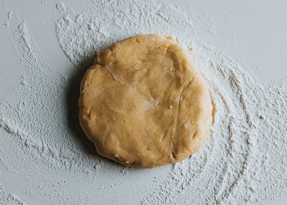C'est très important de ne pas mélanger plus que nécessaire pour ne pas trop défaire le beurre. Si la pâte ne se tient pas encore vraiment, ajouter un peu d'eau, 1 c. à table (15 ml) à la fois, jusqu'à ce que ça se produise. Étaler une grande feuille de pellicule plastique sur une surface de travail. Verser la moitié du mélange de pâte sur la pellicule plastique. Avec l'aide des côtés de la pellicule plastique, écraser le mélange pour former un disque.