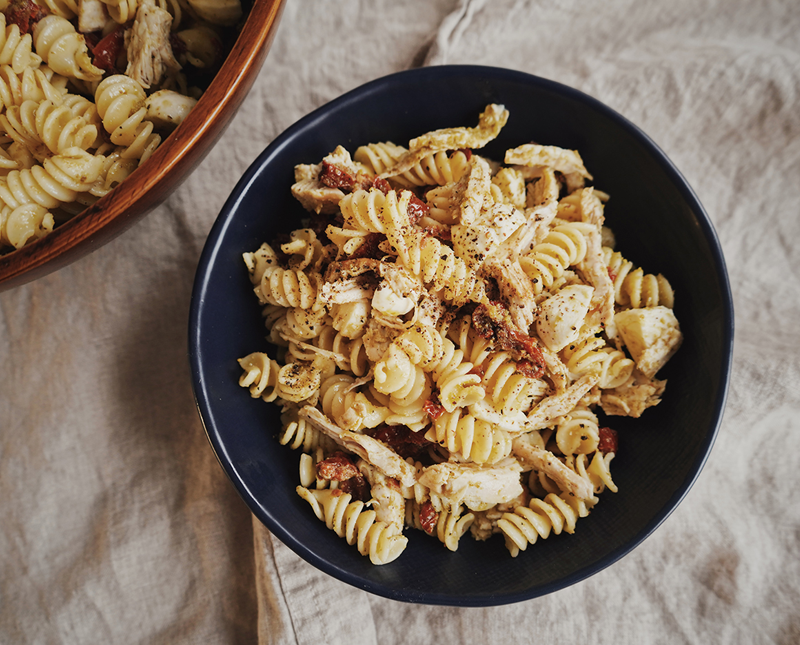 Salade de pâtes à la dinde, bocconcini, pesto et tomates séchées