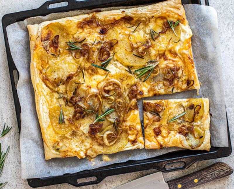 Tarte salée aux pommes de terre, cheddar et oignons caramélisés