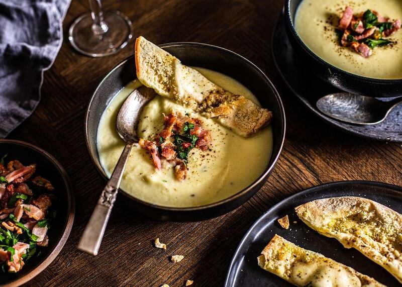 - Velouté de poireaux, pancetta grillée et pains plats « cacio e pepe »