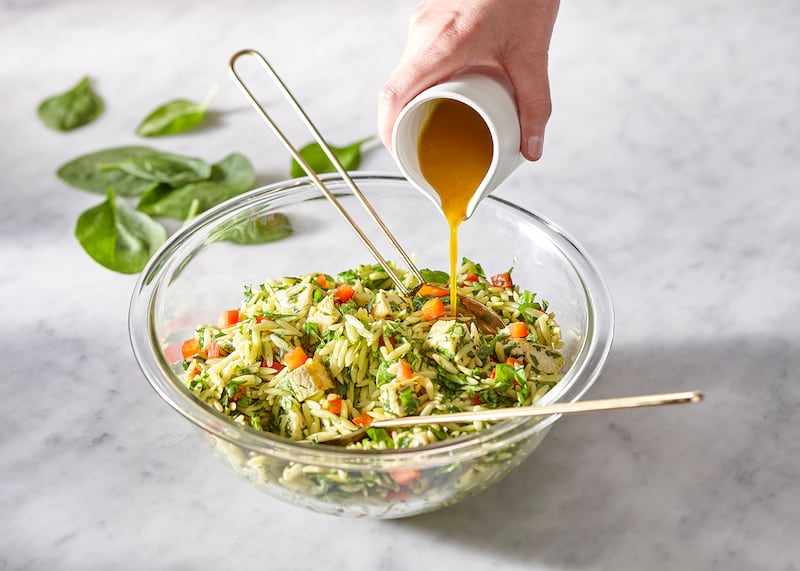 Cette vinaigrette au curcuma et à l’érable sera parfaite avec votre salade d’orzo accompagnée de quelques lanières de poulet.